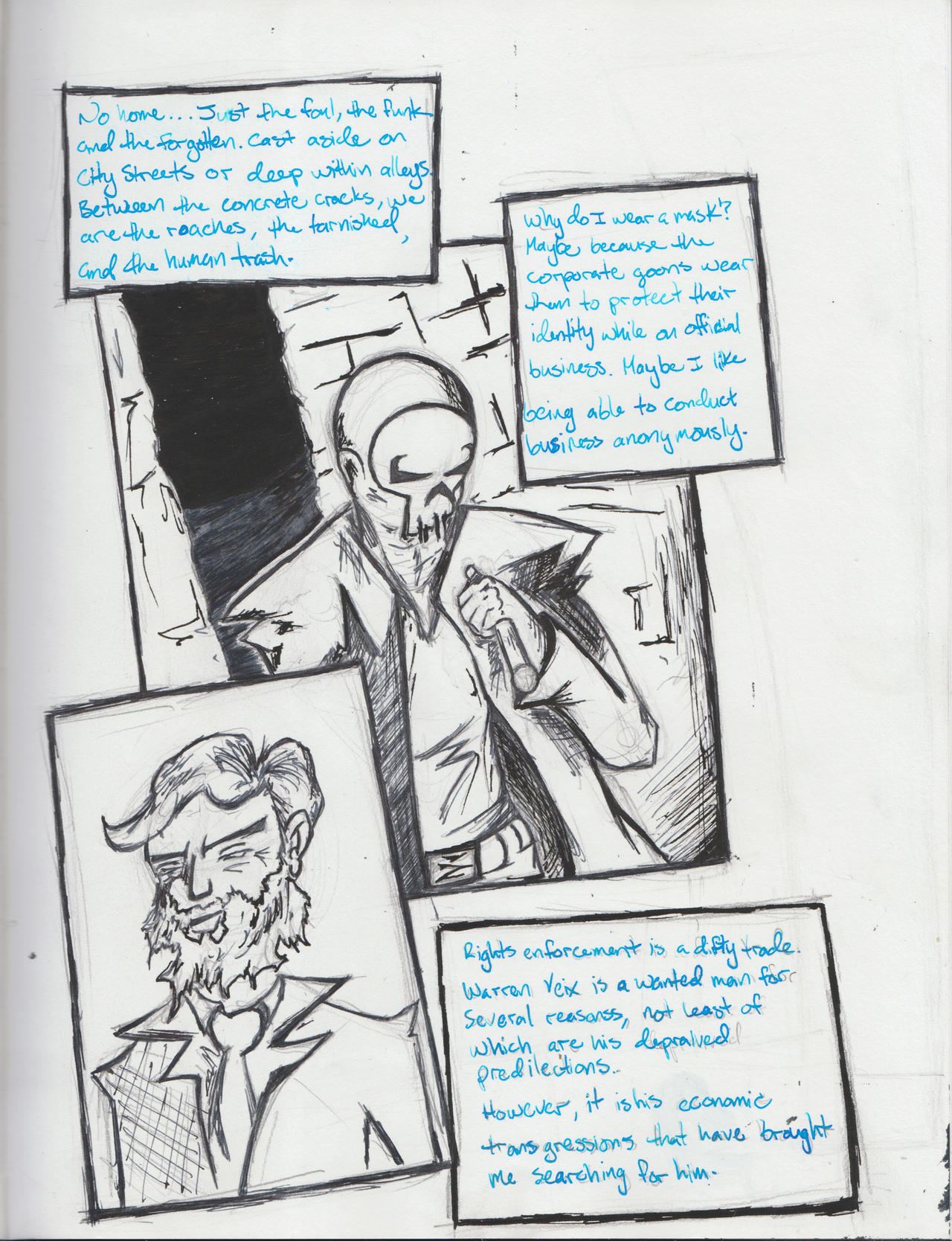 You might be able to tell... I just started drawing pages, one at a time. The first drawing I did was back in August, with the most recent pages being completed just the other week. So it has taken me about 4 months (give or take, because of the holidays), to finish ~13 pages, or ~24 panels, complete with text (narration and dialog).